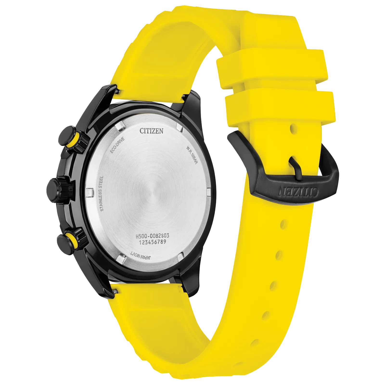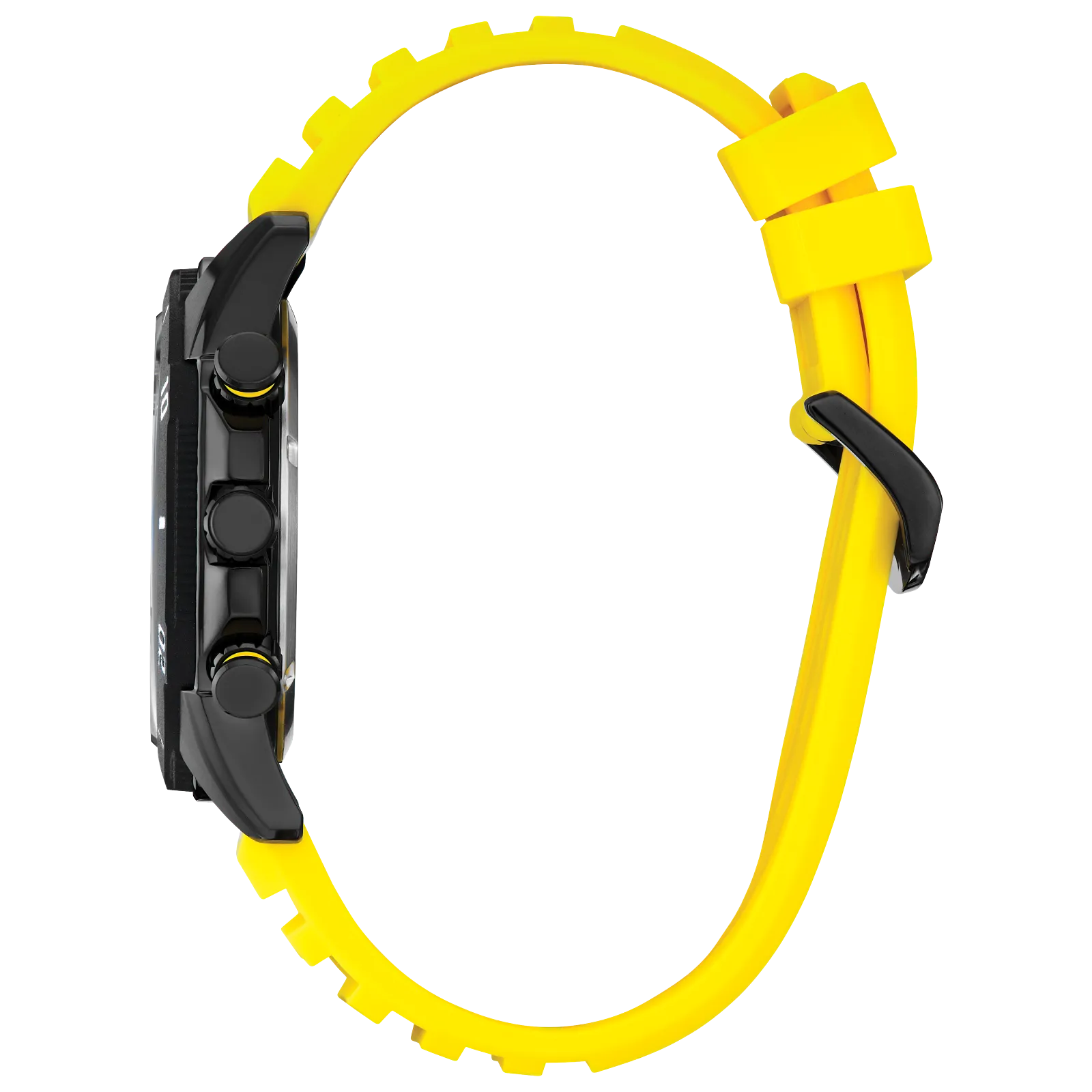 - Esfera negra con tres subesferas, una pantalla taquimétrica interna amarilla y una apertura de fecha a las 4 en punto.