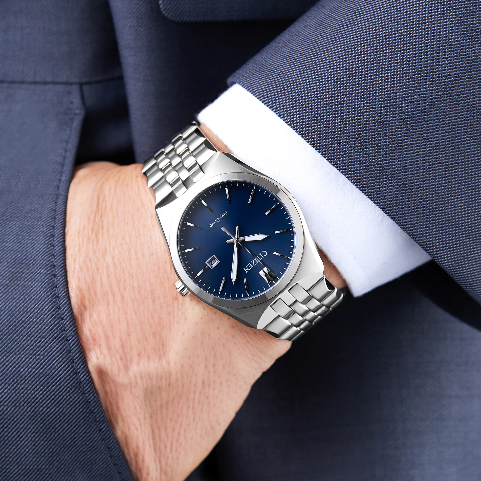 Esfera azul con manecillas plateadas luminosas y marcadores de hora.