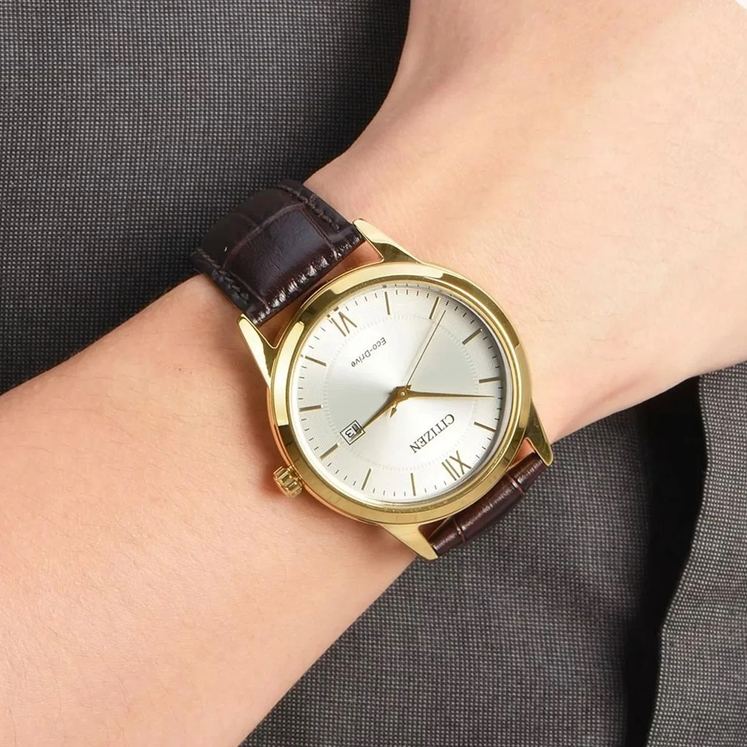 - Caja de acero inoxidable en tono oro amarillo con correa de piel marrón.